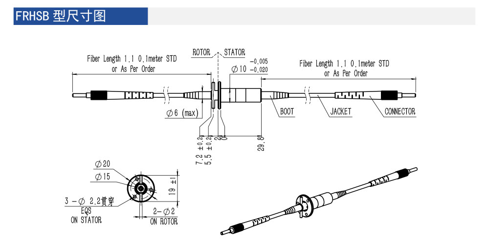 FRHSB 高速型單通道光纖滑環于 2014 年推出,最高轉速可達2.5 萬轉每分鐘,應用于醫療和高速轉臺領域。共包含 FRHSB、FRHSG 兩個擴展型號,其中 FRHSB 為微型,入孔直徑僅為 10mm。
