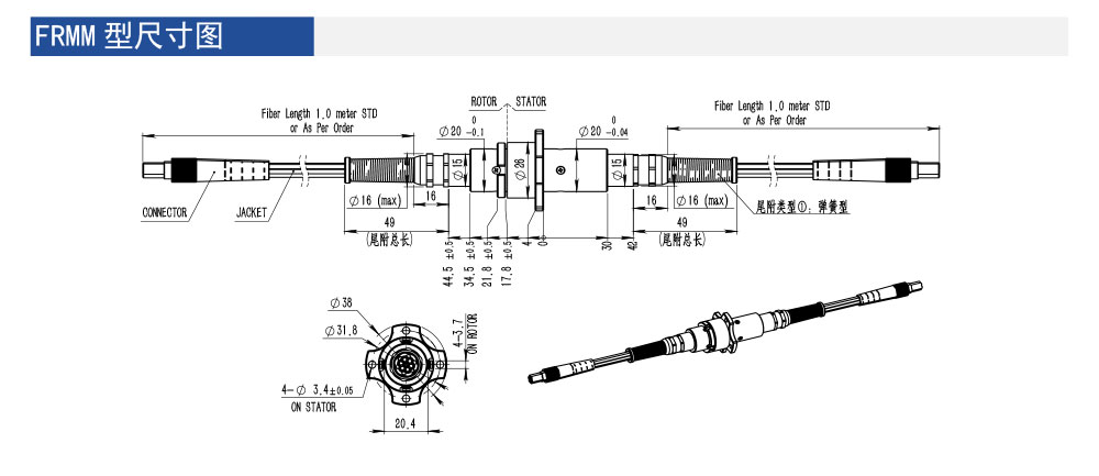 FRMM型光纖滑環為目前尺寸較小的多通道光纖滑環,入孔尺寸僅為20mm,最多可以實現7個通道。可選擇單模、多模或者單多模混合,并有耐環境 (沖擊、震動、高低溫) 級別的產品可供選擇。